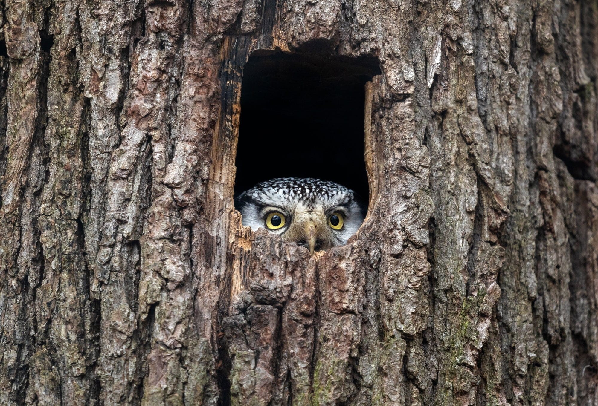 A northern hawk-owl peeks out of its home in a tree hollow. Photo: Getty / Andyworks