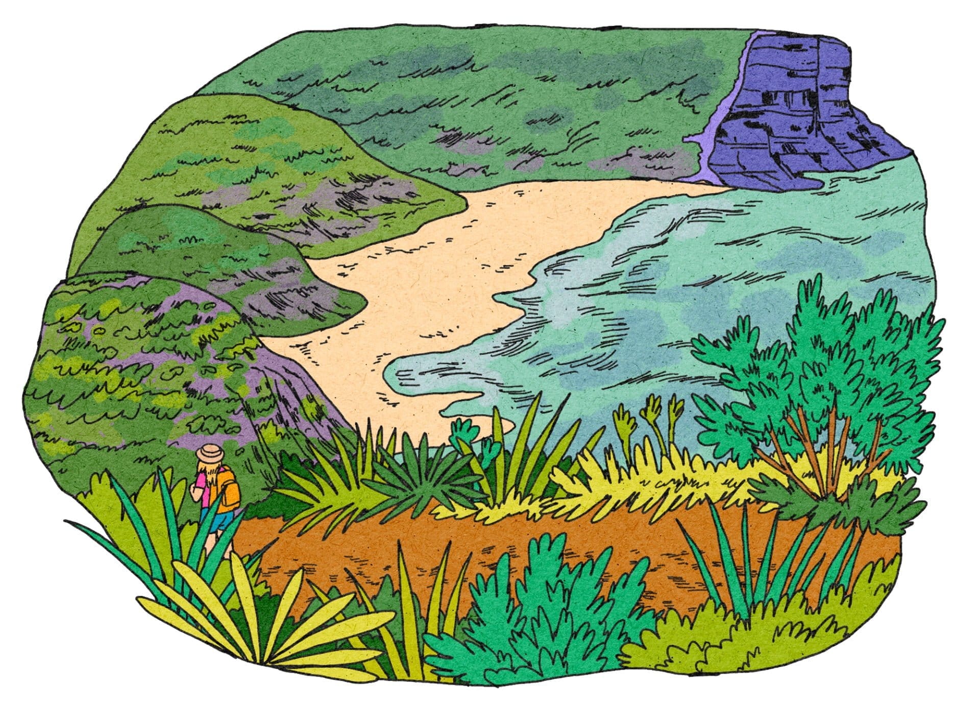 The Noosa hinterland is the first stop on my itinerary, and I spend my first two days staying in a turmeric-coloured rammed-earth lodge set high on a hill, visiting a permaculture farm, kayaking through the Everglades, and generally just throwing myself back into the world with all the gusto of a cooped-up travel writer. My chosen spot for the next night is in as unglamorous a town as you could imagine, popular with fishermen and with only thirty-eight people living in it. But it is also set on the banks of a pretty river lined with mangroves, the campground isn’t overrun, and it feels simple in a way that takes me back to my childhood. I crack the back windows open, pull the boot door closed, click on the fairy lights I brought with me, and settle in to read my book.