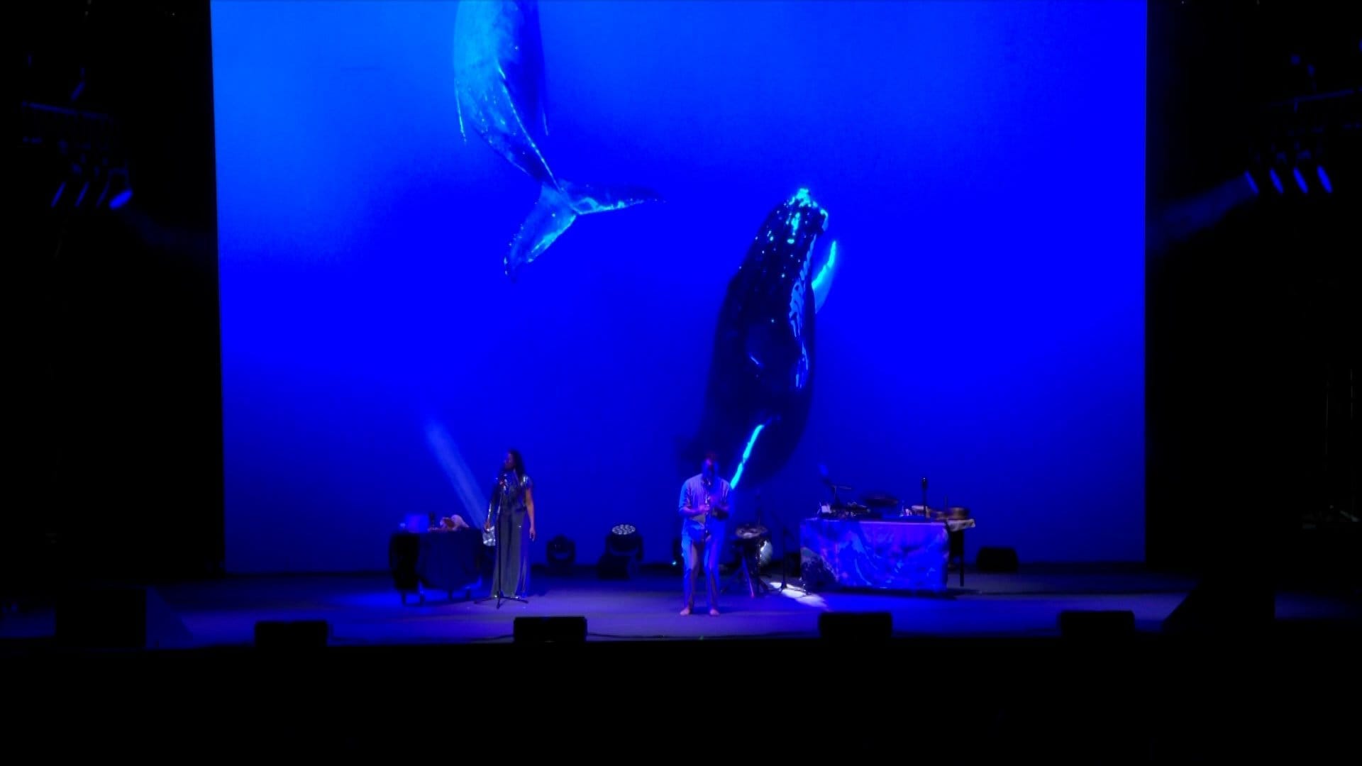 Her voice soars and plummets, mirroring and amplifying the sounds and movements of a giant whale swimming on the screen behind her, along with live music by Joshua Sam Miller inspired by the sounds of the ocean. In a dress of shimmering silver, Whaia resembles an otherwordly hologram – her voice somehow channelling the past and future simultaneously. The music transcends sound alone to become a physical experience, reverberating deep inside your chest.